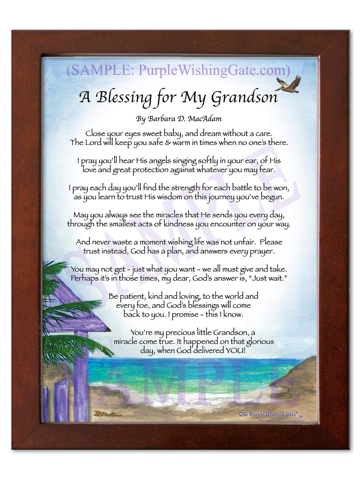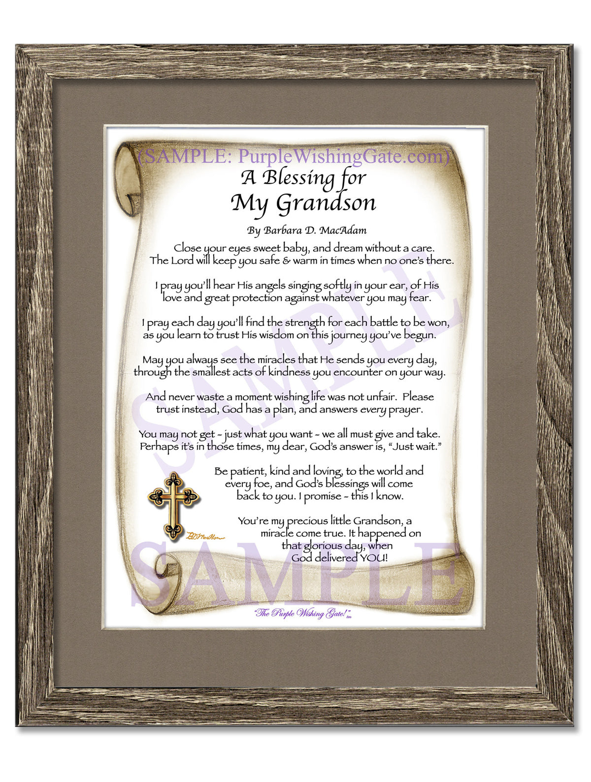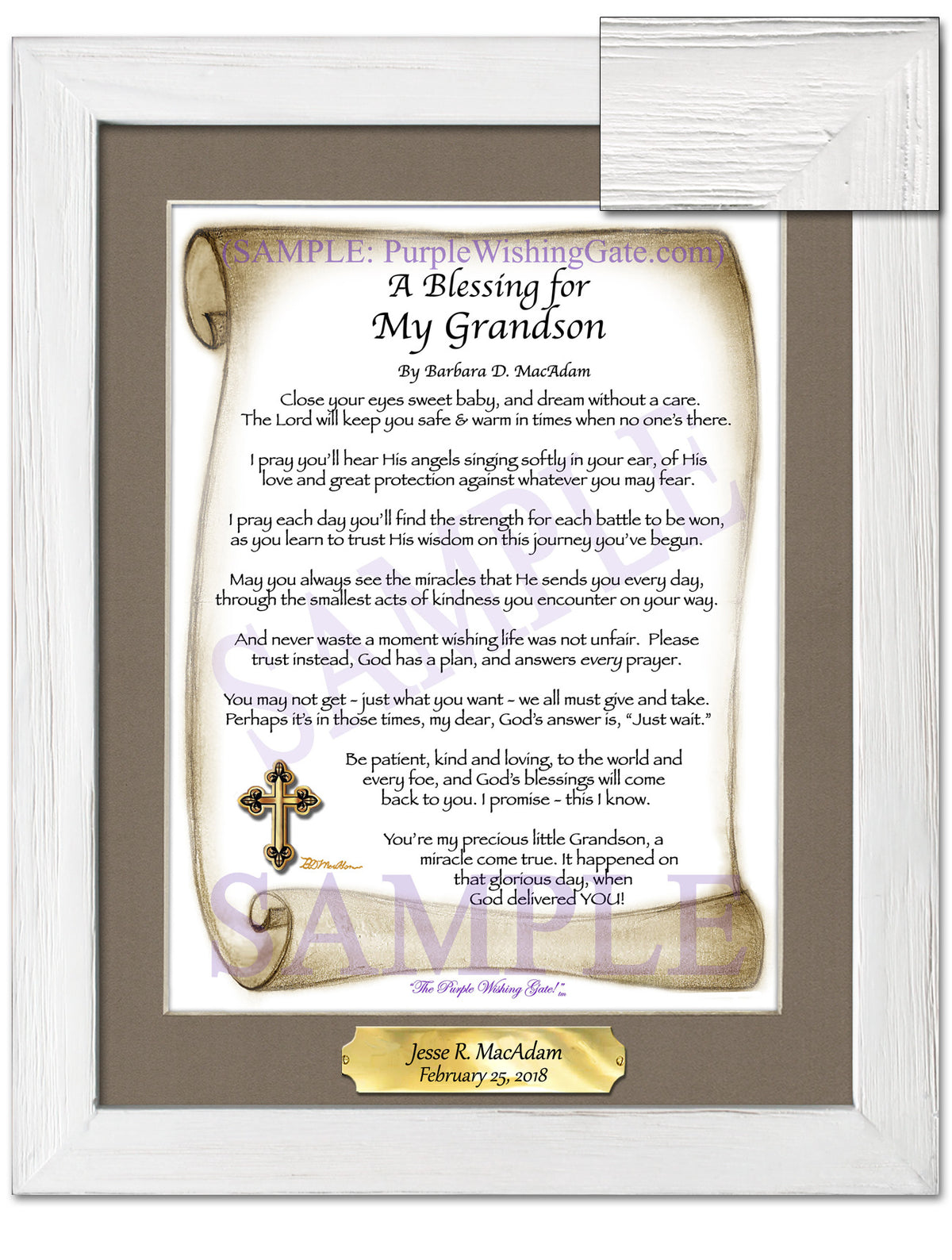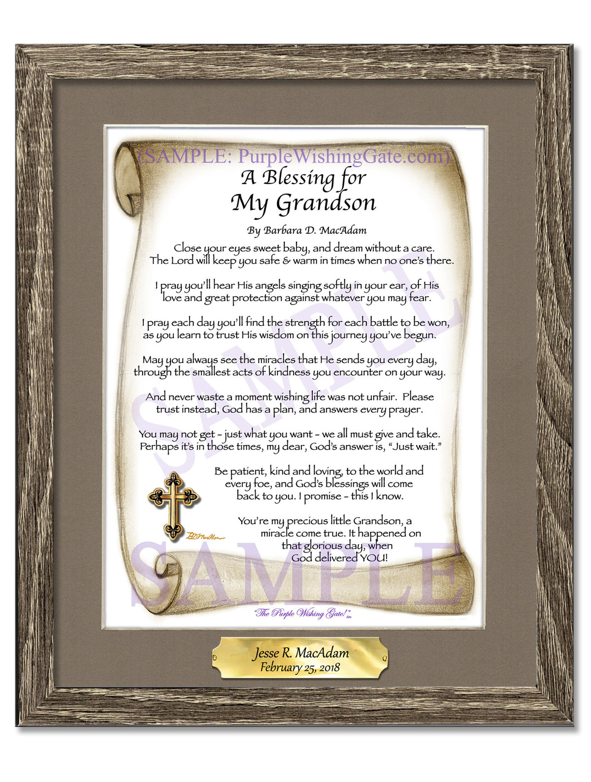 "A Blessing for My Grandson" is a beautiful baby blessing, uniquely written for your Grandson, telling him how much you love him and that God is always looking out for him. It's a one-of-a-kind baby gift that can be personalized and framed, making it a keepsake he'll cherish forever!