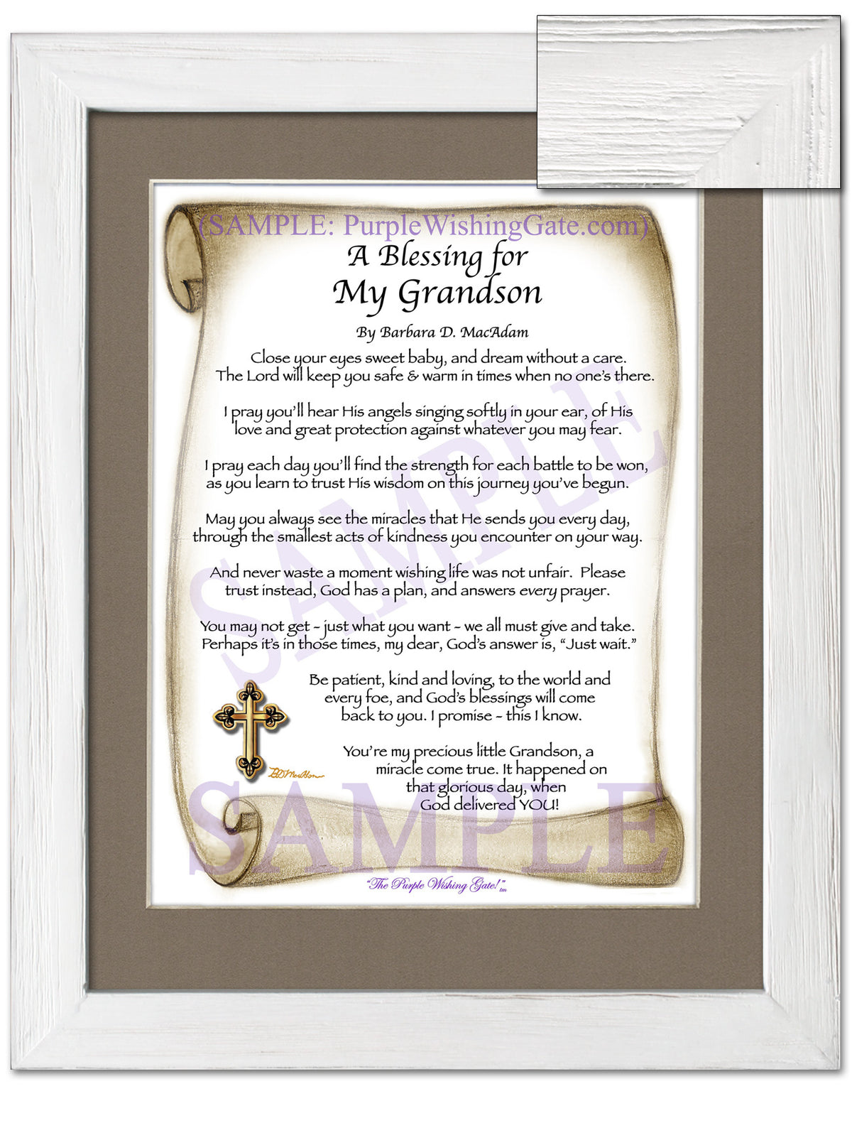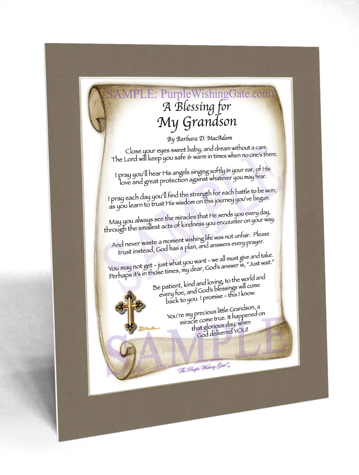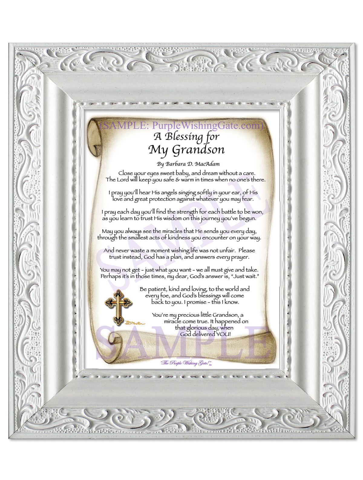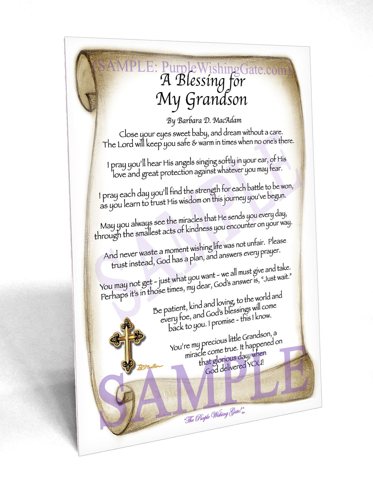 "A Blessing for My Grandson" is a beautiful baby blessing, uniquely written for your Grandson, telling him how much you love him and that God is always looking out for him. It's a one-of-a-kind baby gift that can be personalized and framed, making it a keepsake he'll cherish forever!