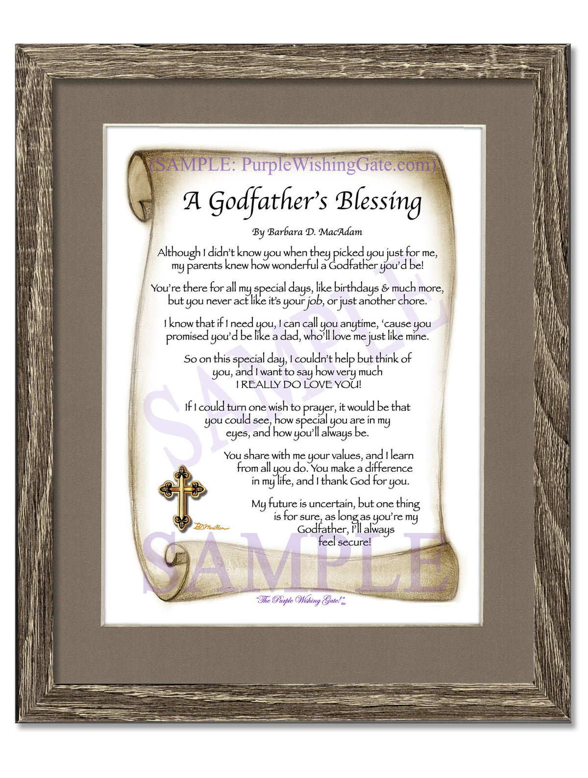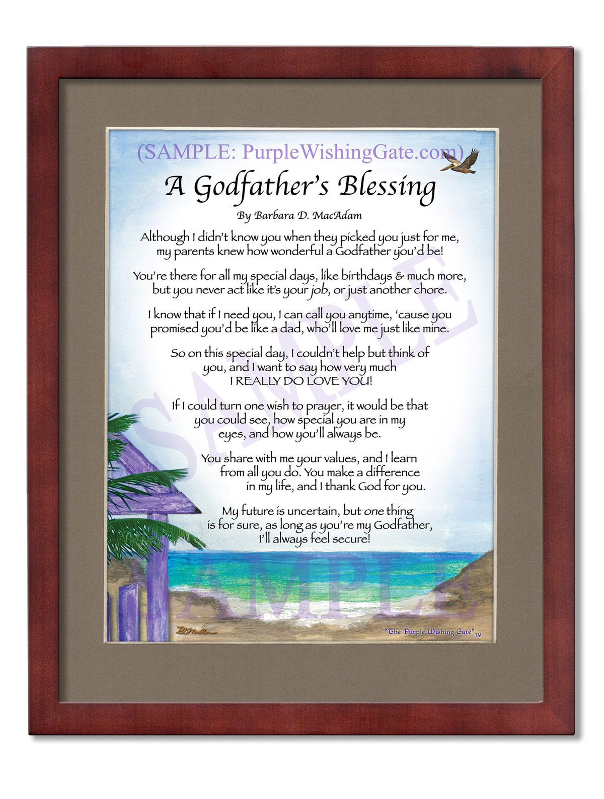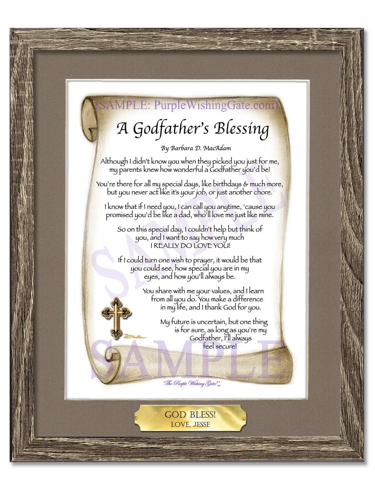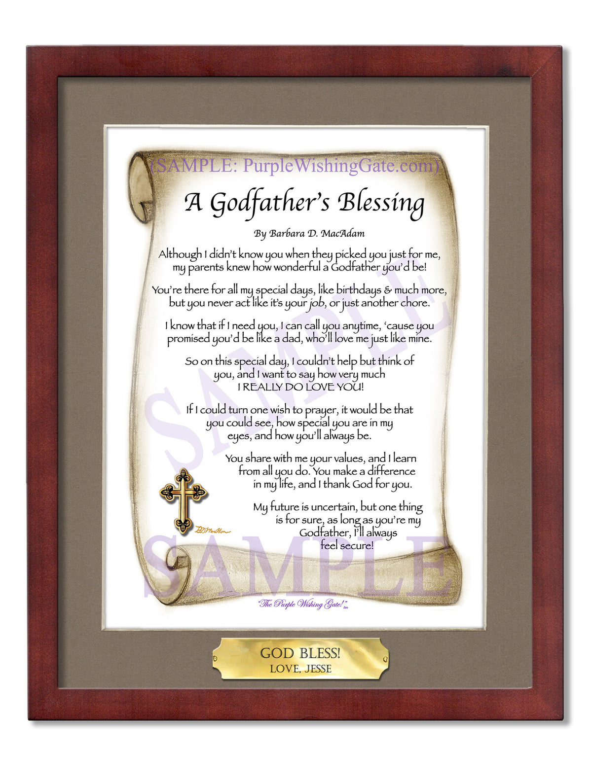 "A Godfather's Blessing" is a heartwarming poem, appropriate for any special occasion. It tells him how much he's loved and how blessed you are to have him in your life. This one-of-a-kind gift can be personalized and framed into a keepsake he'll cherish forever!