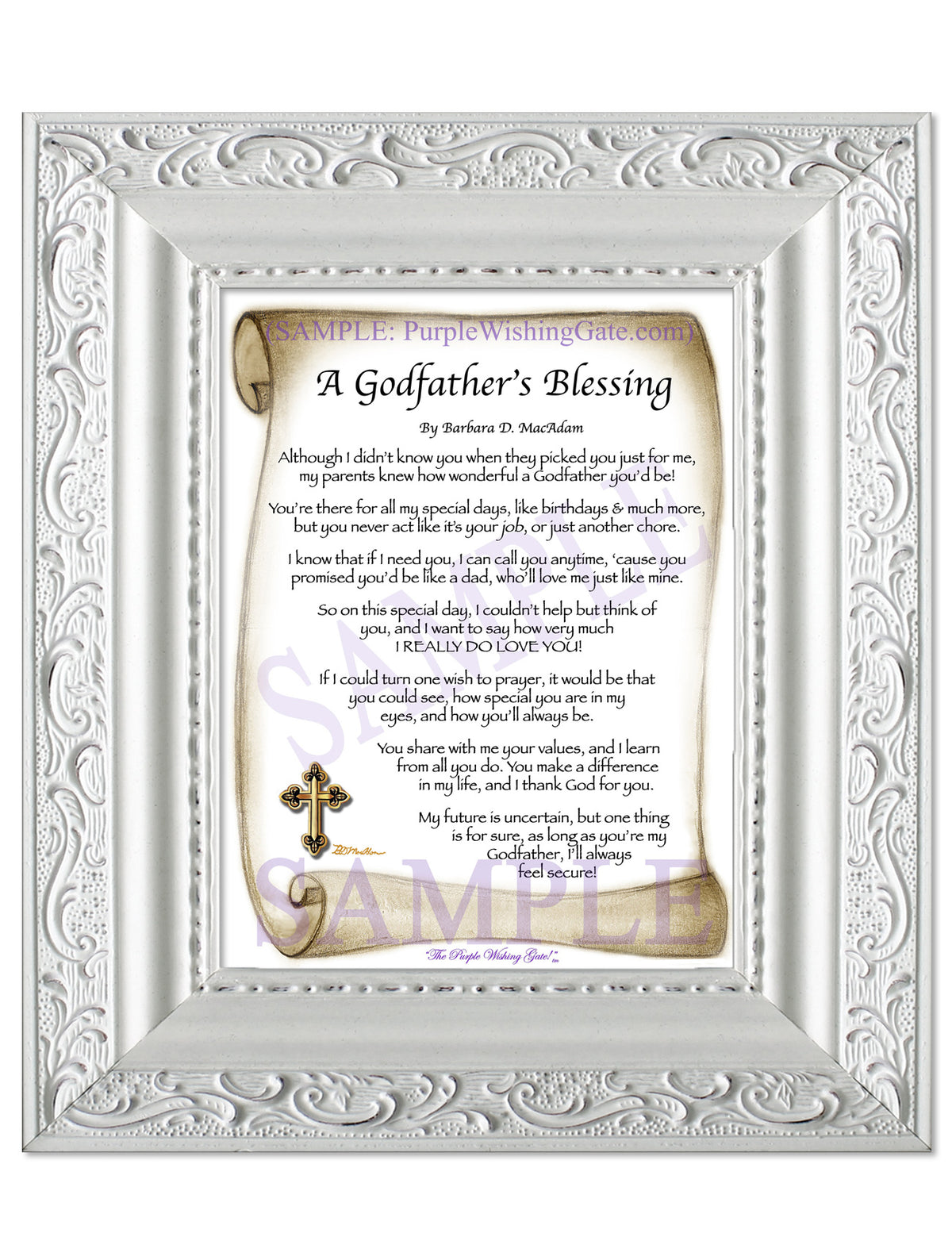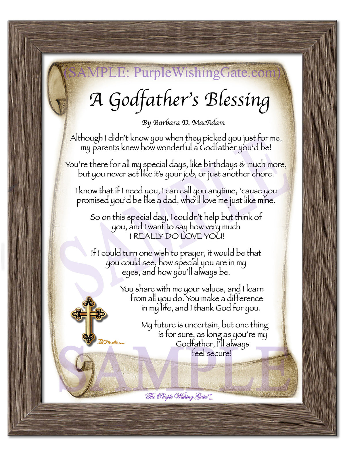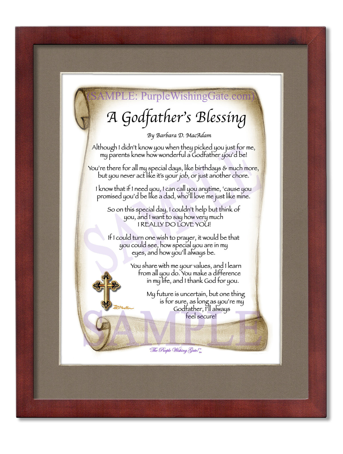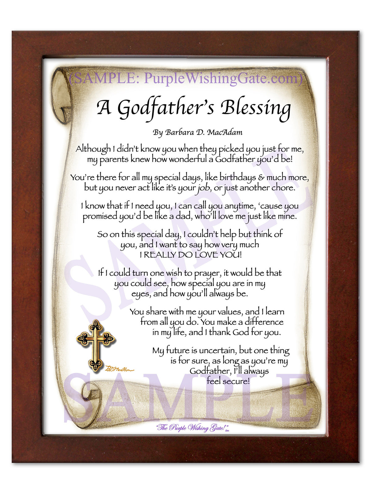 "A Godfather's Blessing" is a heartwarming poem, appropriate for any special occasion. It tells him how much he's loved and how blessed you are to have him in your life. This one-of-a-kind gift can be personalized and framed into a keepsake he'll cherish forever!